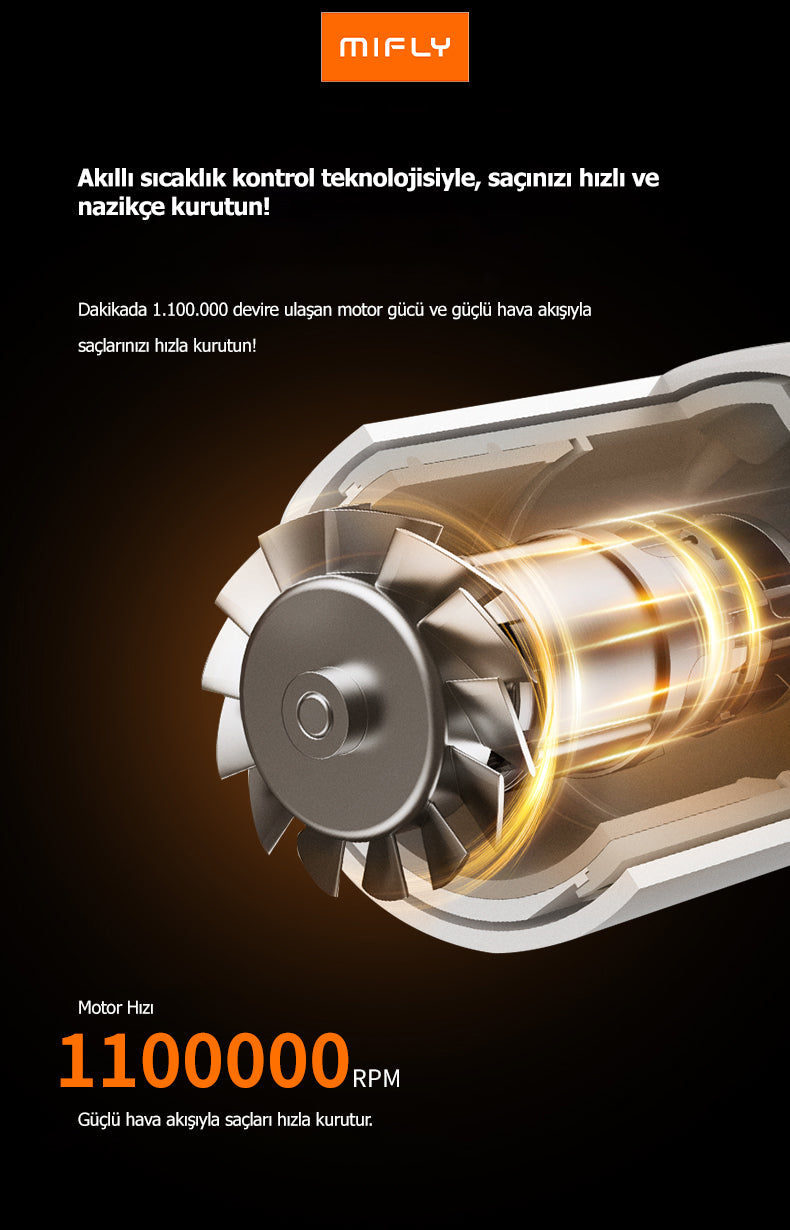 Mifly'nin yüksek hızlı motor teknolojisi, güçlü hava akımı sağlayarak kurutma sürenizi kısaltır ve saçı aşırı ısıya maruz bırakmaz. Böylece: