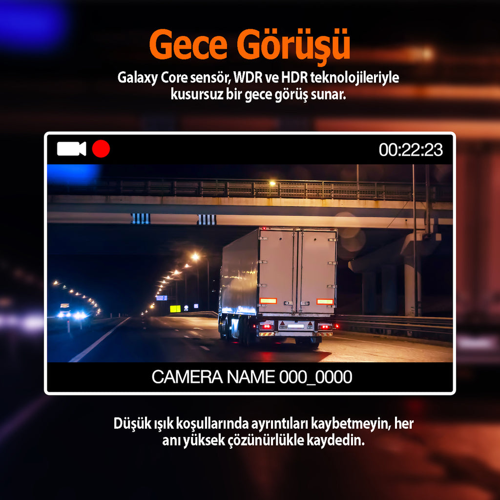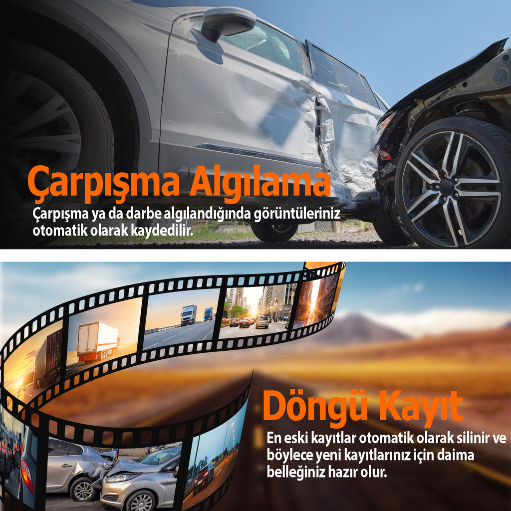 G-sensörü sayesinde, herhangi bir çarpışma veya darbe algılandığında kayıtlarınız otomatik olarak kilitlenir ve silinmeye karşı korunur. Ayrıca, döngü kayıt özelliğiyle en eski kayıtlar otomatik olarak silinir ve yeni kayıtlar için her zaman yer açılır. Önemli anlarınız daima güvende olur.